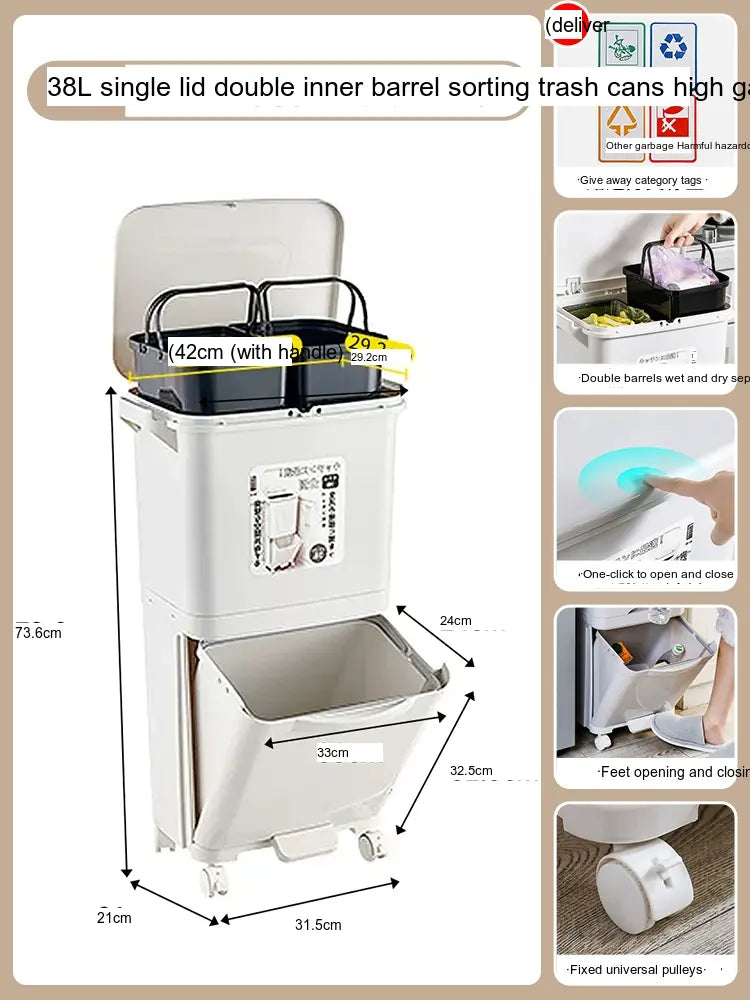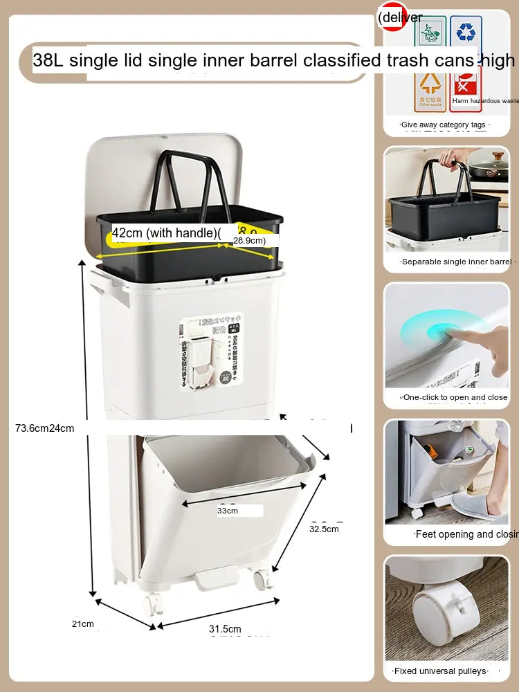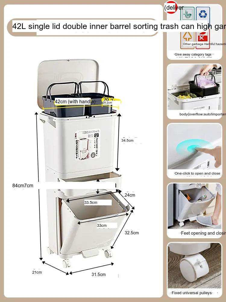 The bin features a flip-top lid with a soft-close mechanism, smooth pull-out drawers, and a detachable carry bin that makes disposal effortless. Built-in wheels allow you to reposition the bin with ease, making it highly practical for busy kitchens and households.