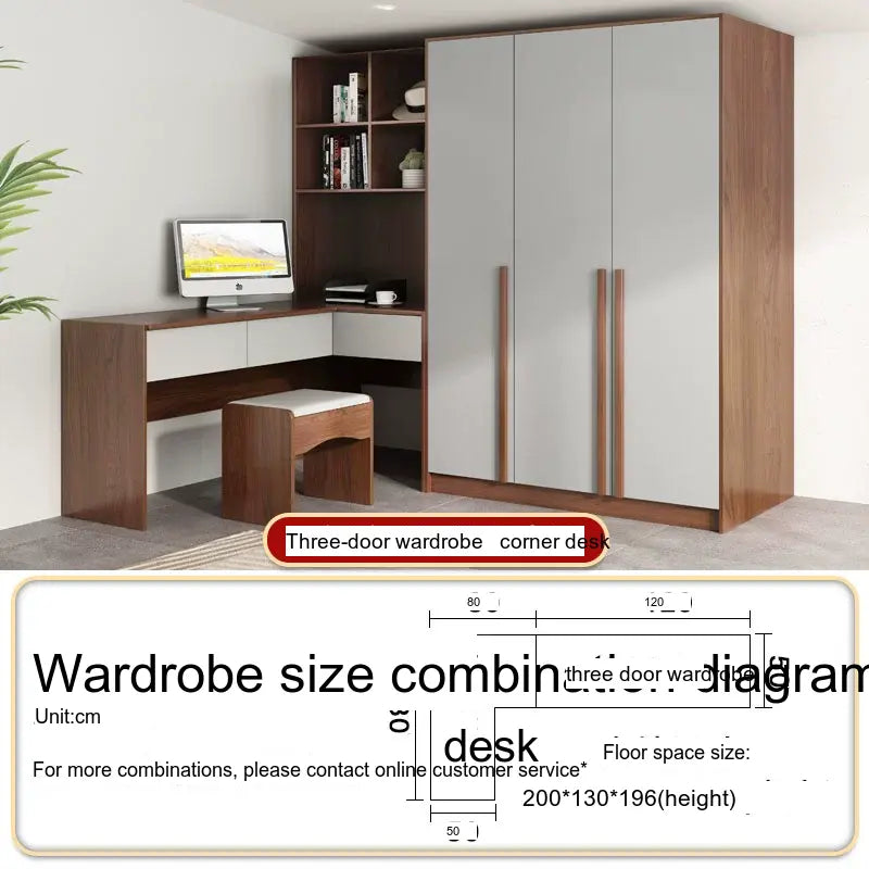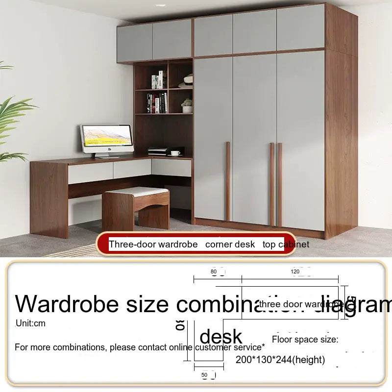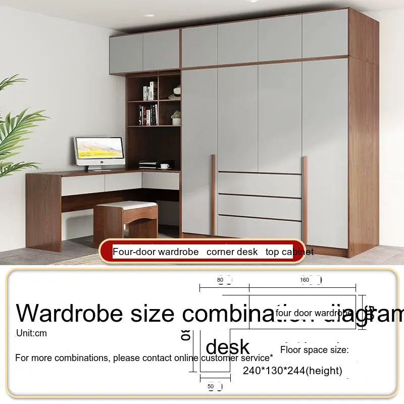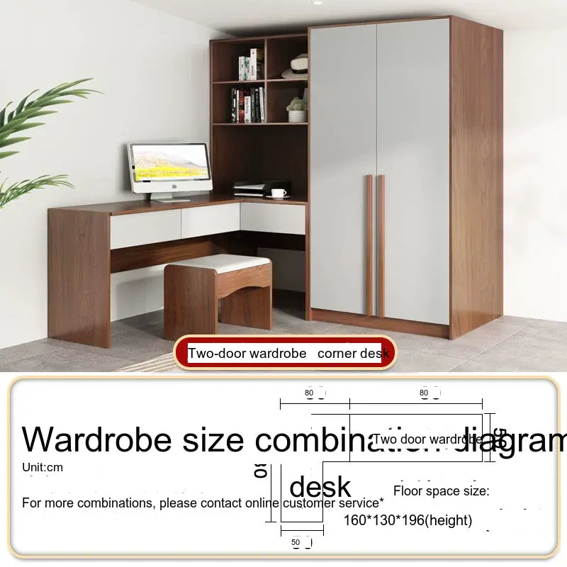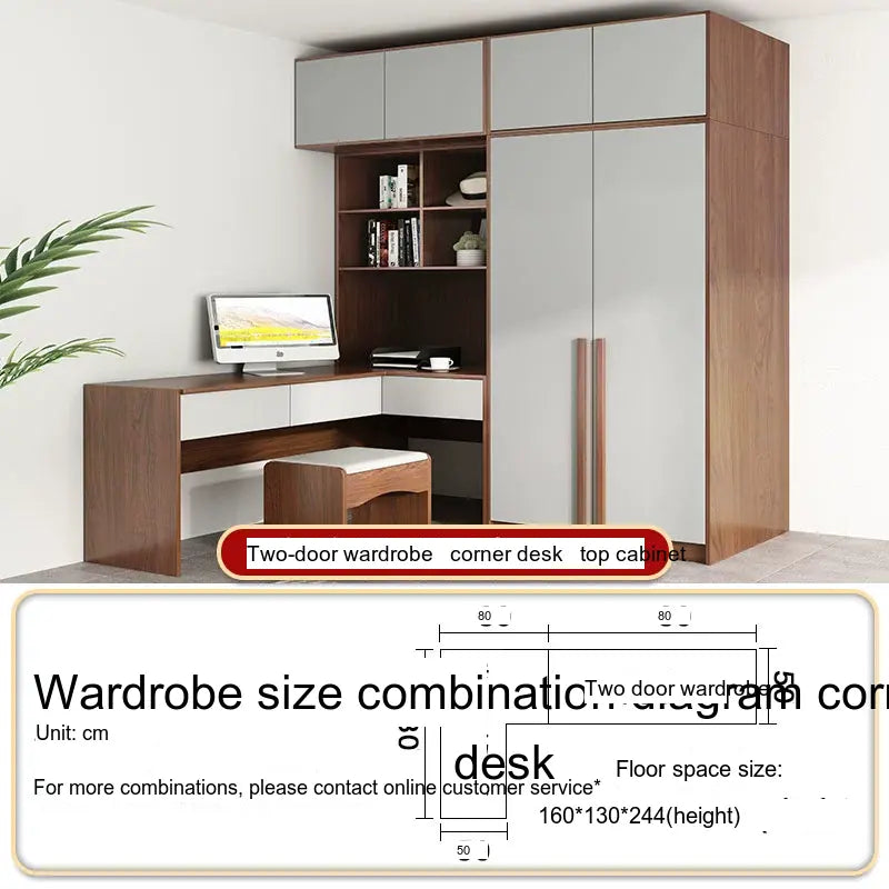 The wardrobe comes in a stylish light gray and walnut color combination, providing an inviting ambiance while also allowing for personalization to match your existing décor. You can choose from individual wardrobes or opt for configurations that include additional top cabinets or even corner desks, enhancing both utility and style.