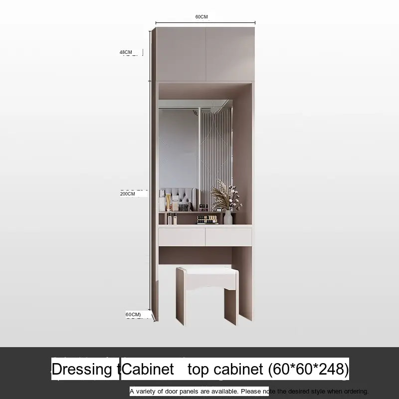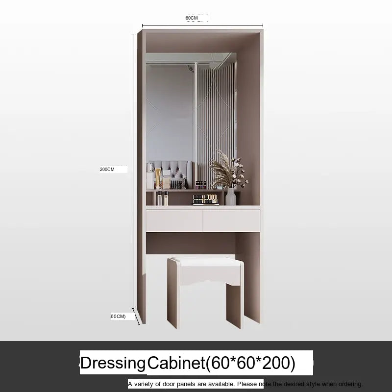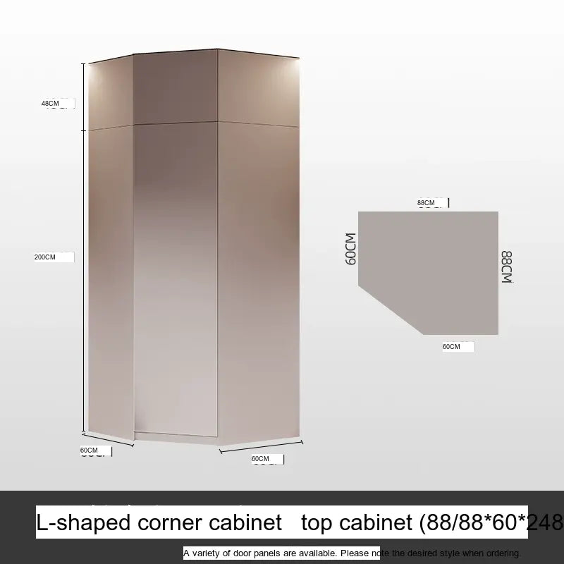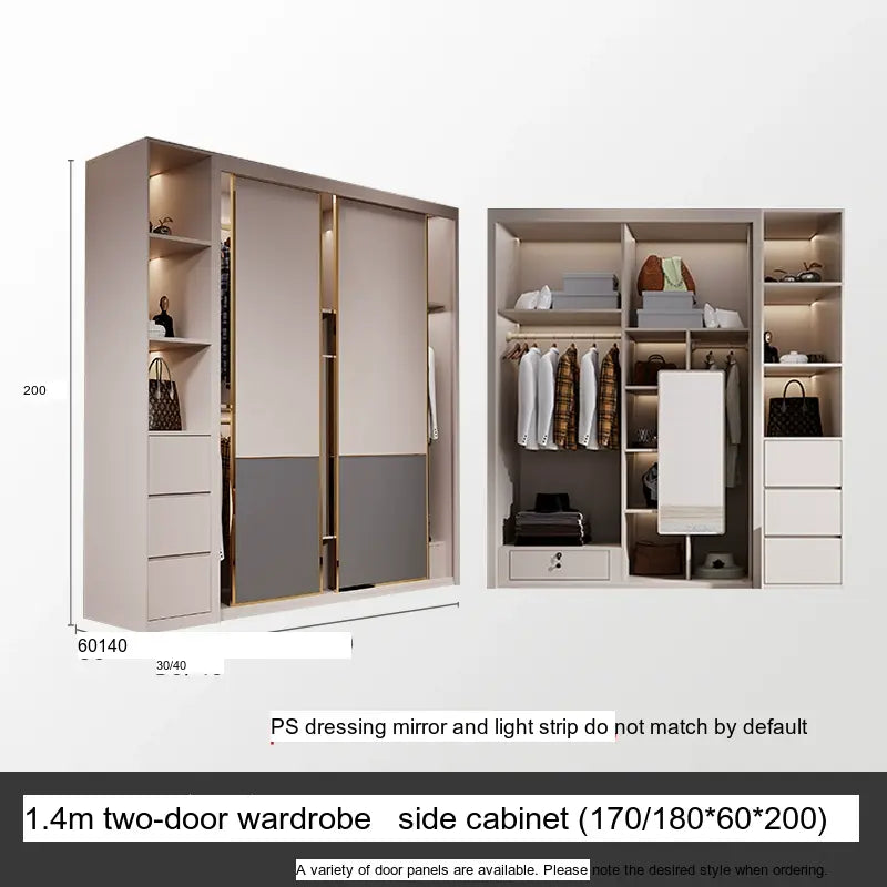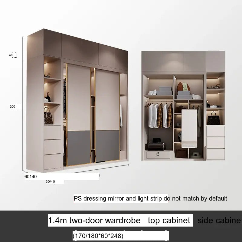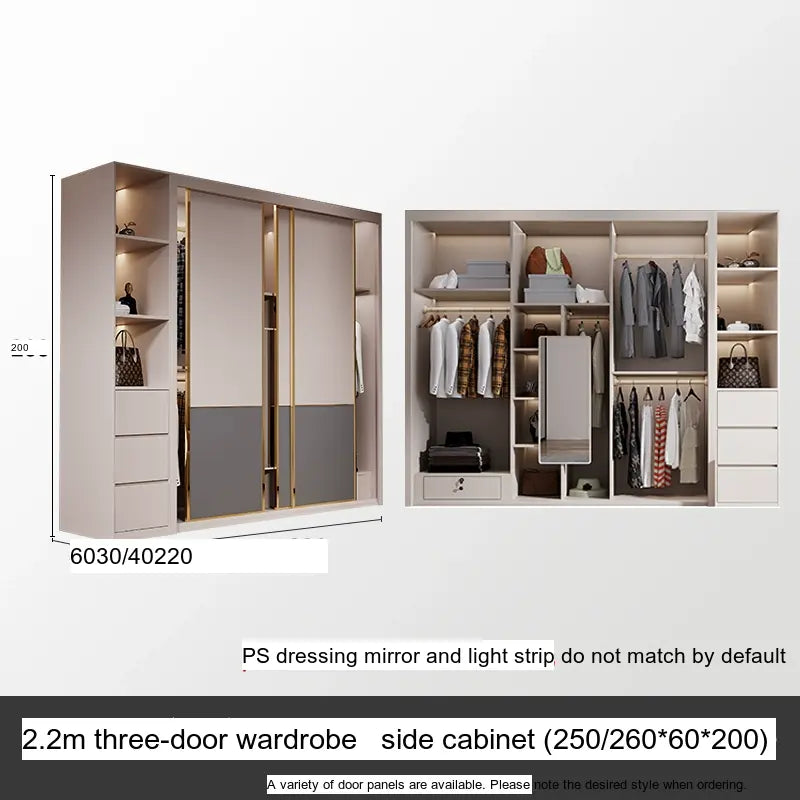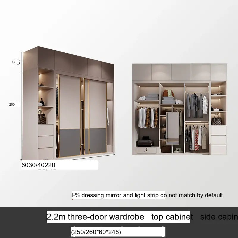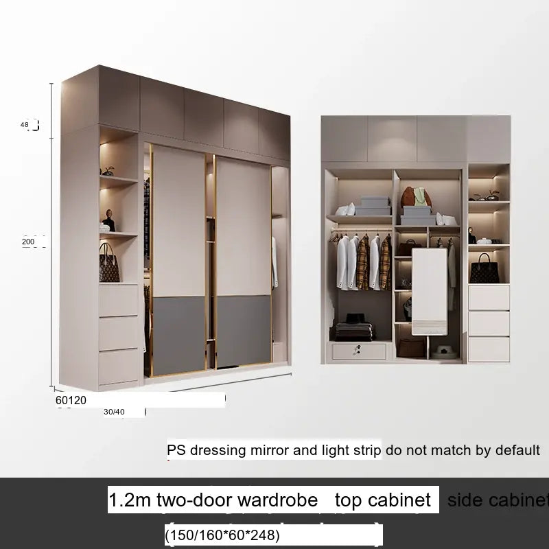 This wardrobe boasts a light luxury style, enhancing your home's aesthetic appeal with its sleek lines and sophisticated finish. The artistic patterns on the surface add a touch of uniqueness, setting it apart from typical wardrobes. The available sizes, ranging from 1.2m to 2.4m, along with optional side and top cabinets, provide versatility and adaptability to various room dimensions and personal needs.