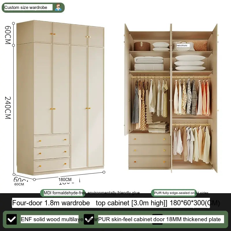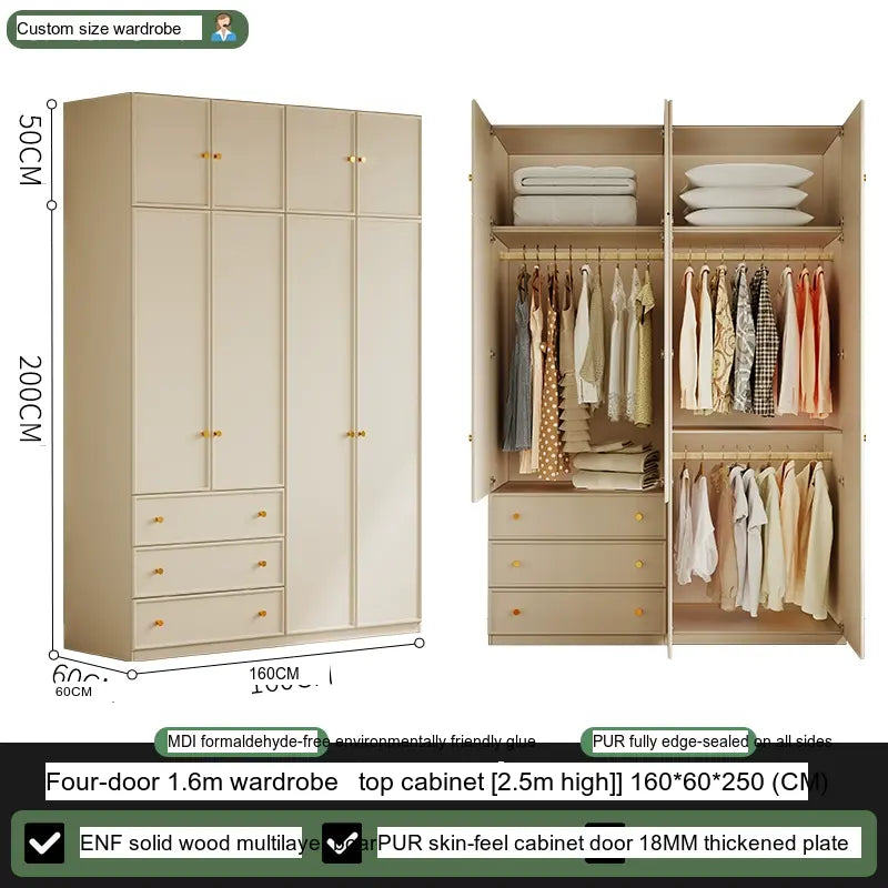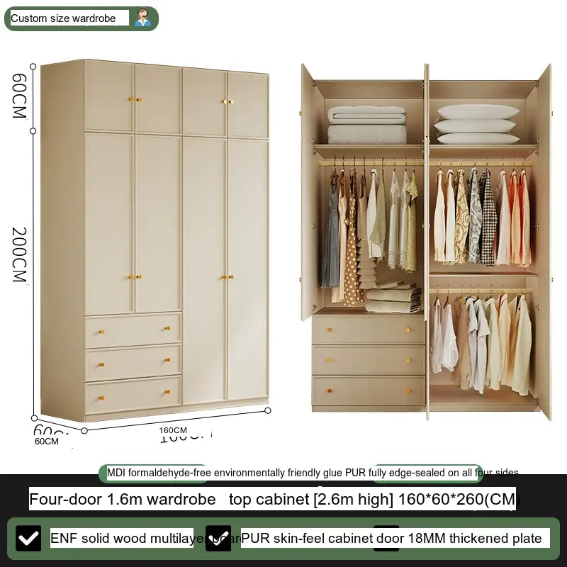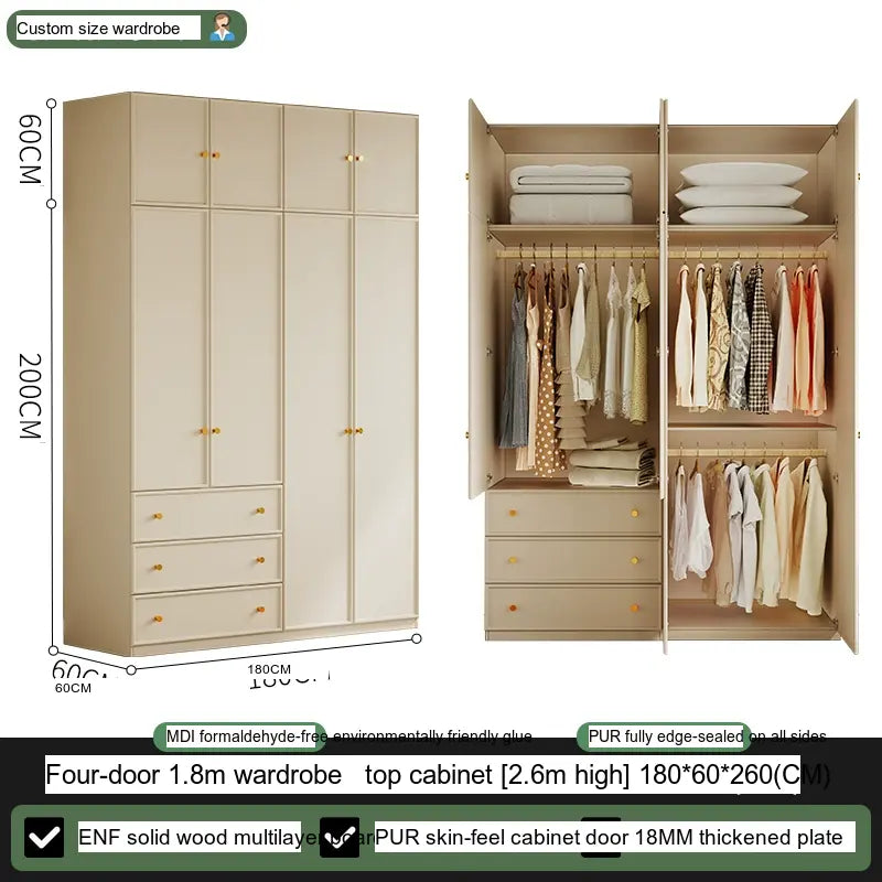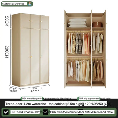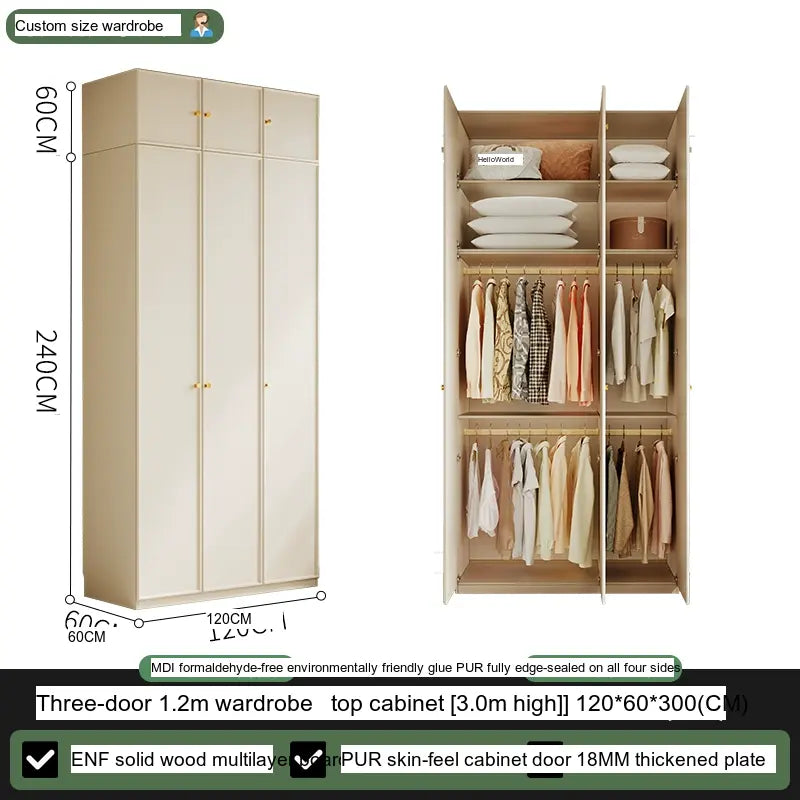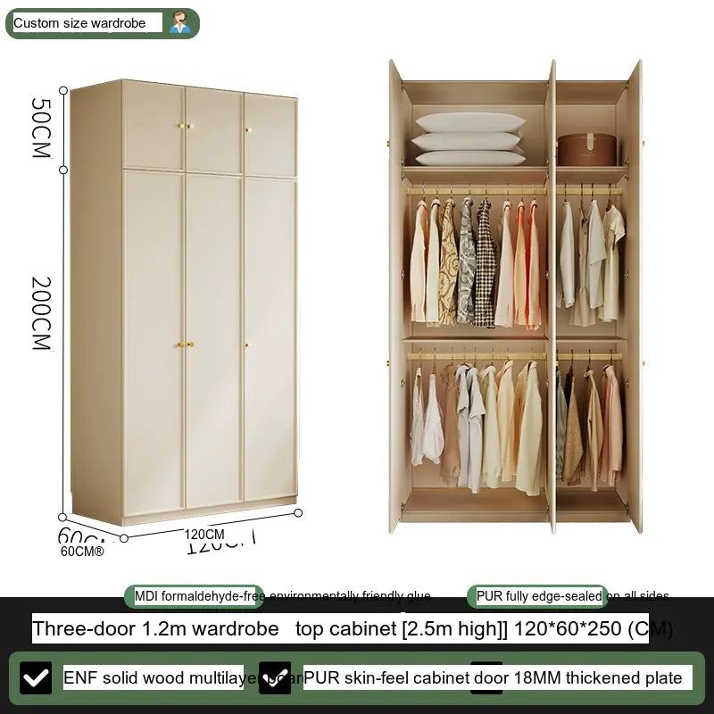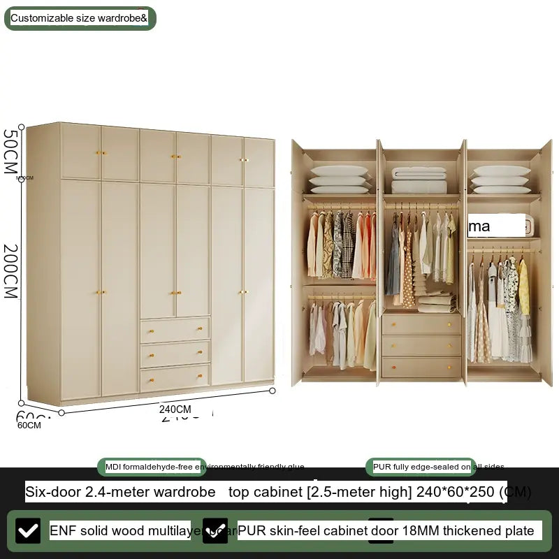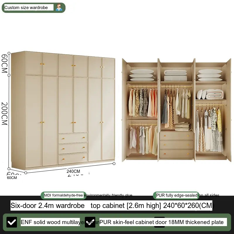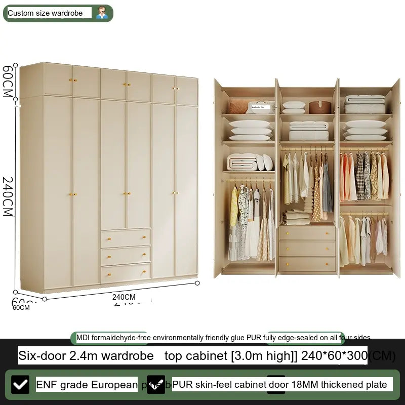 Available in multiple configurations—1.2 meters three-door option, 1.6 meters four-door option, 2 meters five-door variety, and the 2.4 meters six-door option—this wardrobe is designed to accommodate your unique storage requirements. The addition of a ceiling cabinet offers even more vertical storage space, ideal for organizing seasonal clothing, bedding, and other bulk items, keeping your living area clutter-free.