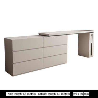 Visually, the gentle color palette and sleek linear design create a charming yet modern minimalist effect. The table features a thickened desktop of 50mm, ensuring both sturdiness and practicality for daily use. Invisible handles contribute to its sleek aesthetic, while the milk tea-colored surface contrasts elegantly with metal accents, epitomizing refined elegance.
