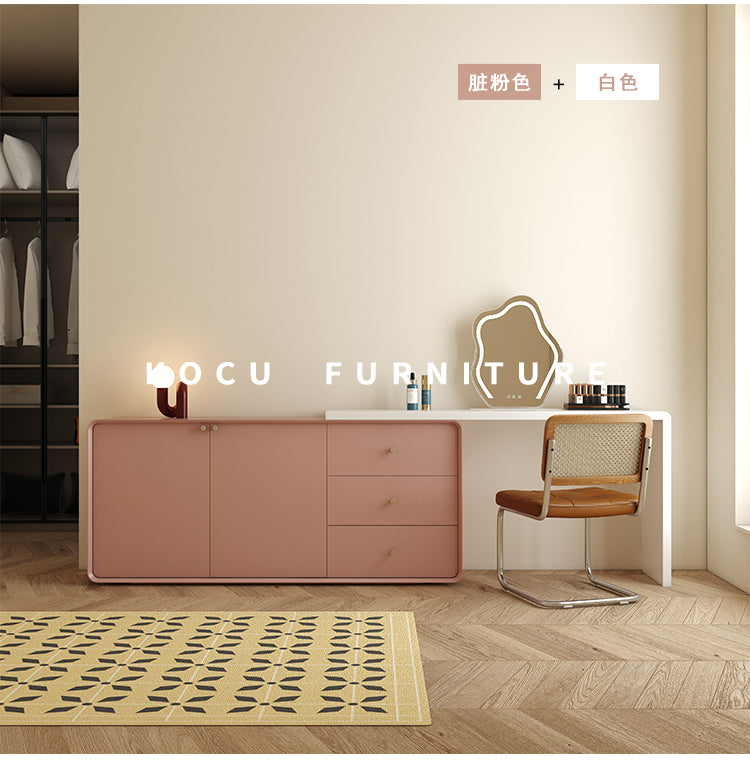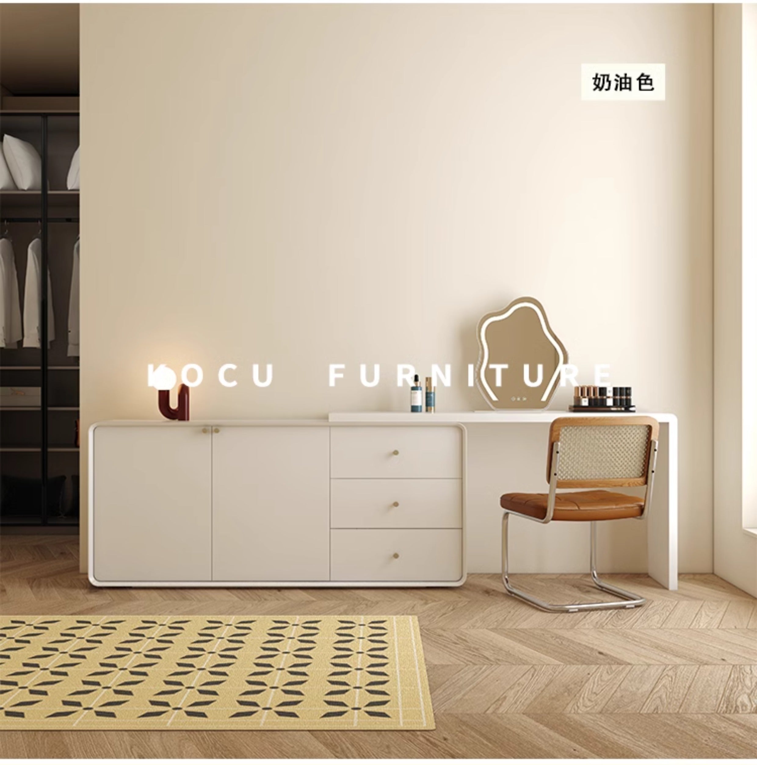 Moreover, the KOCU HOME Isadora dressing table is characterized by its smooth, rounded edges that have been polished several times to ensure gentle and safe handling. It also boasts a baseboard design that prevents dust accumulation, facilitating easier maintenance.
