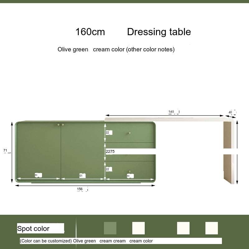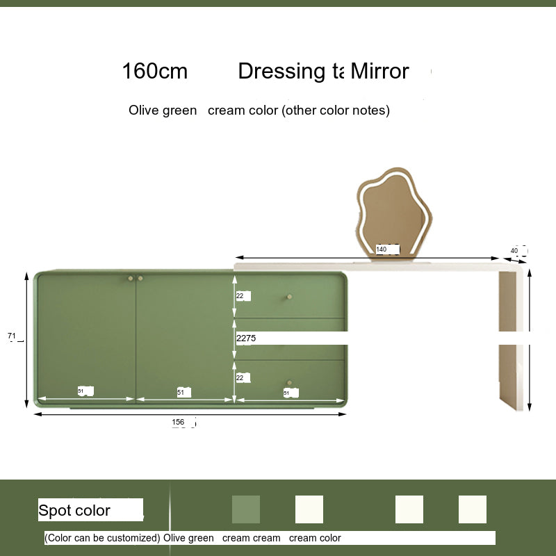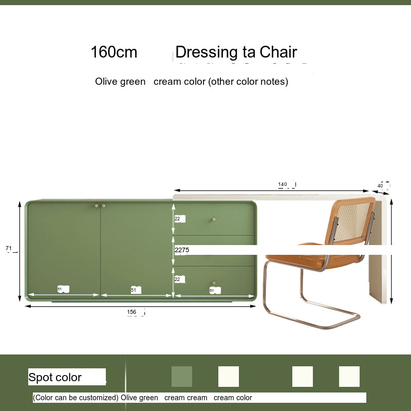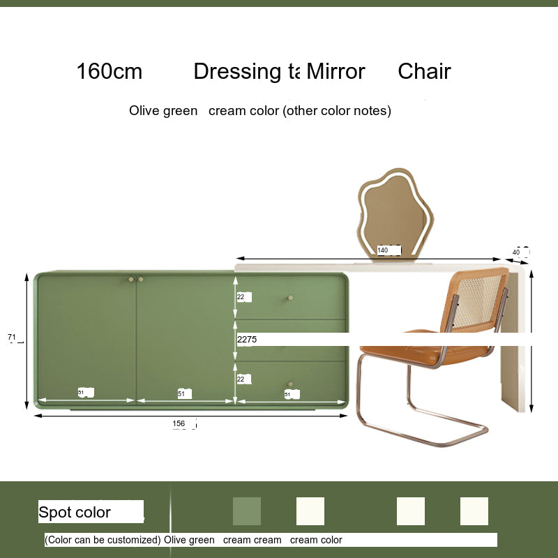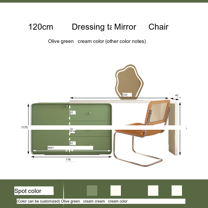 This stunning dressing table comes in multiple configurations, allowing you to choose the option that best suits your needs. Whether you prefer a 120cm or 160cm table, with or without a mirror, there is a perfect setup for everyone. Select from elegant color options such as cream or olive green, or opt for customized colors to match your unique style. The distinguishing features include a dual-door design with spacious drawers for organized storage and easy access to your beauty essentials.