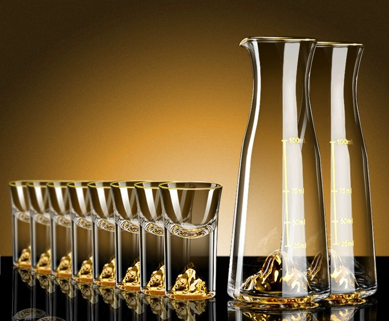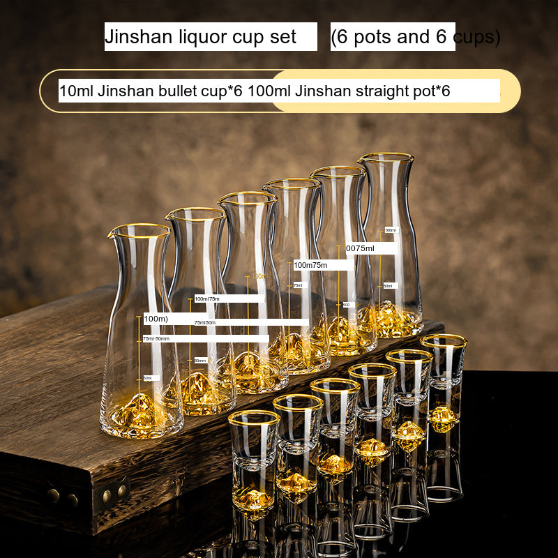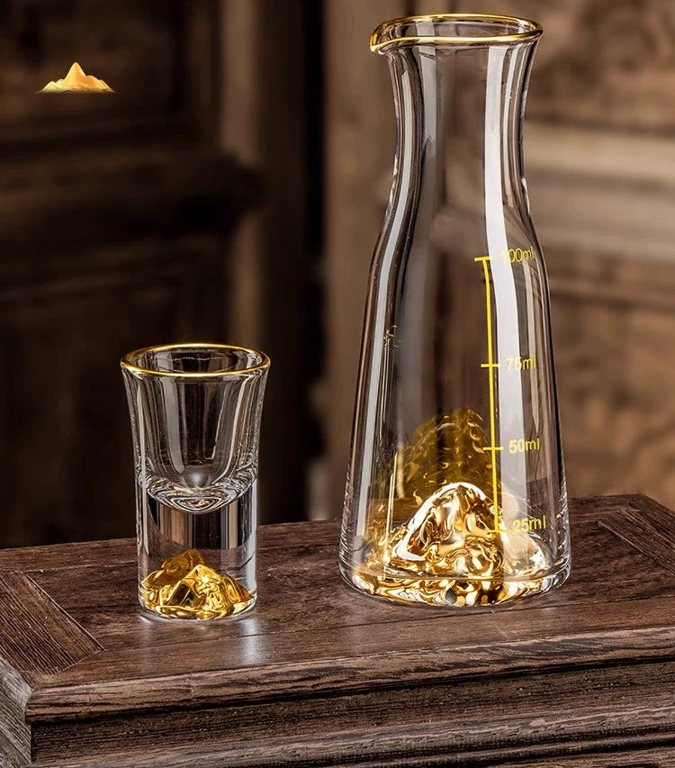 The Jinshan Gold Foil Decanter and Shot Glass set is a masterpiece that combines functionality with exquisite craftsmanship. Each piece is handmade from high-quality crystal glass, featuring elegant gold foil accents that showcase traditional Chinese artistry. Ideal for special occasions or as a luxurious addition to your home bar.