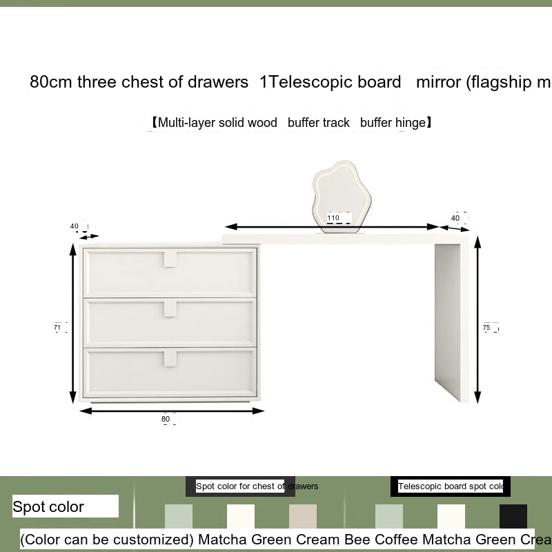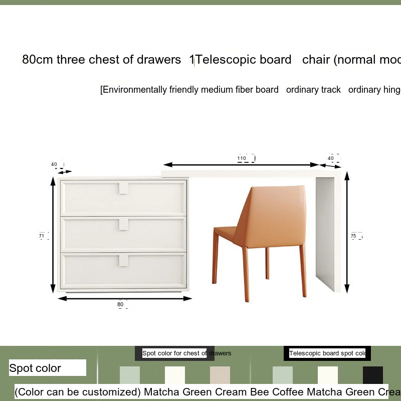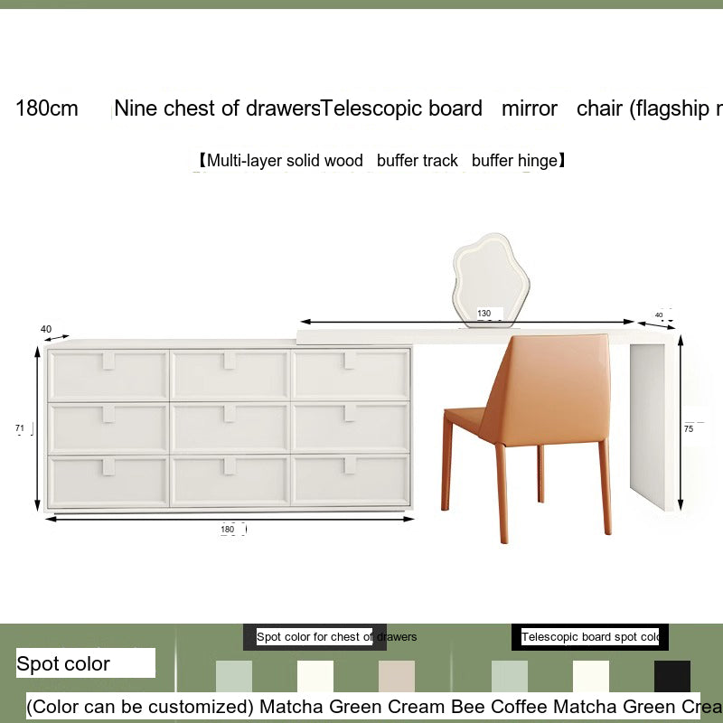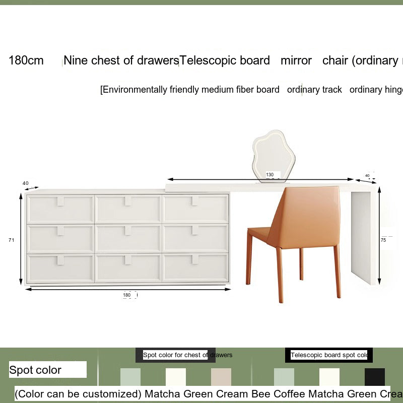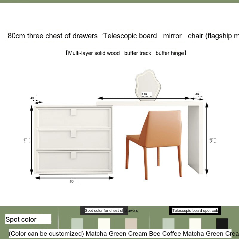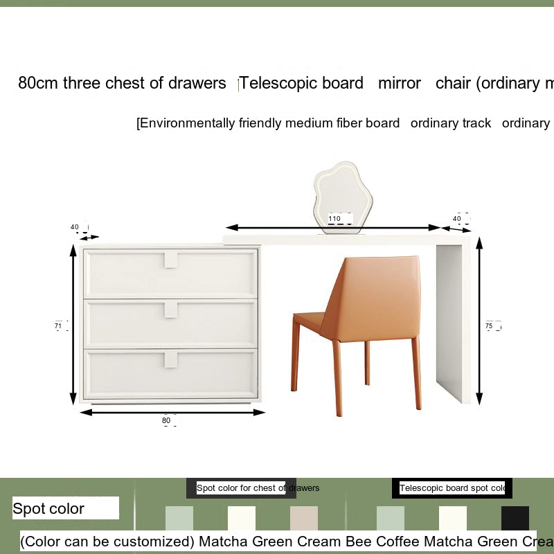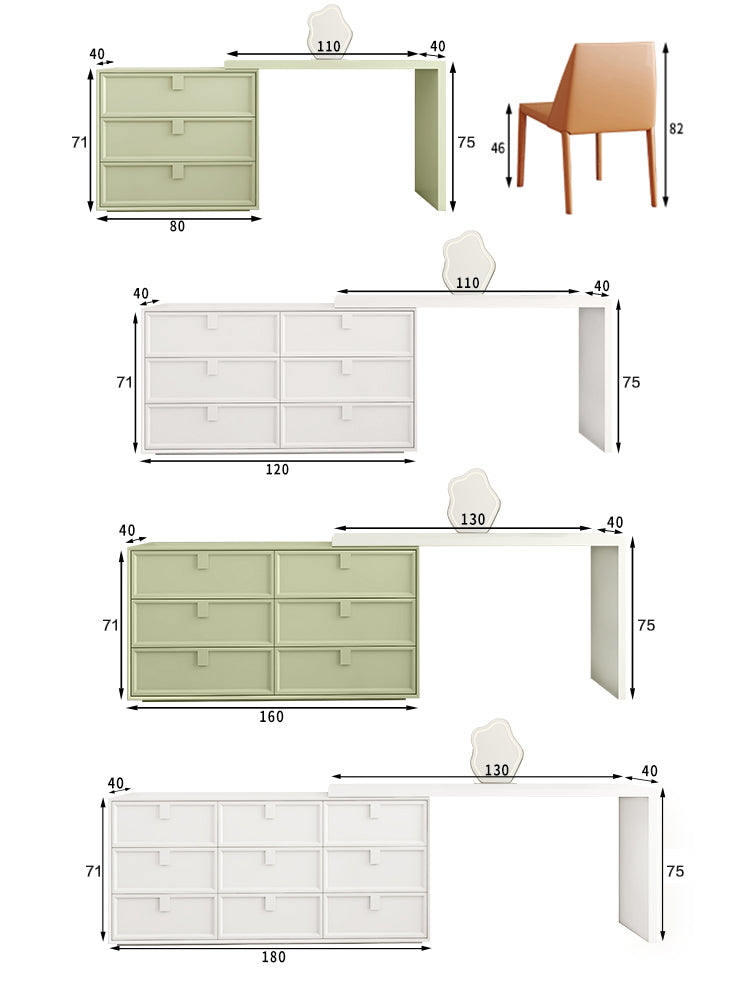 This versatile makeup table set is available in multiple sizes, ranging from 80cm, 120cm, up to 180cm, accommodating different space requirements and personal preferences. Each table features a telescopic board that can be adjusted to your desired comfort height.