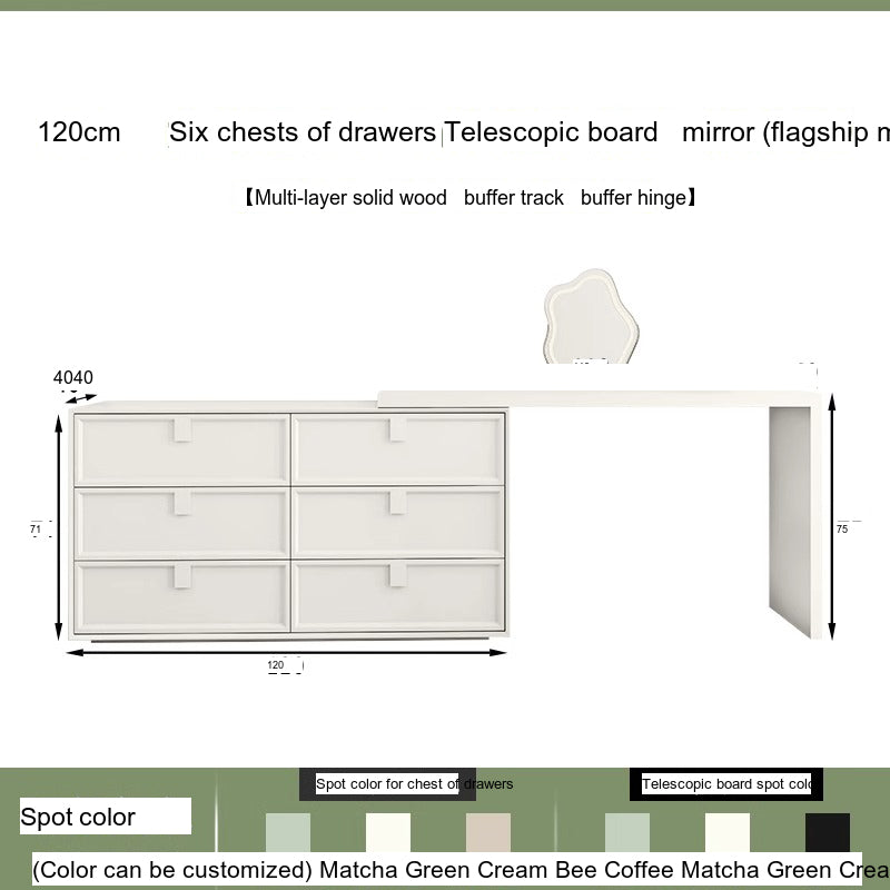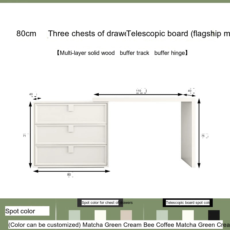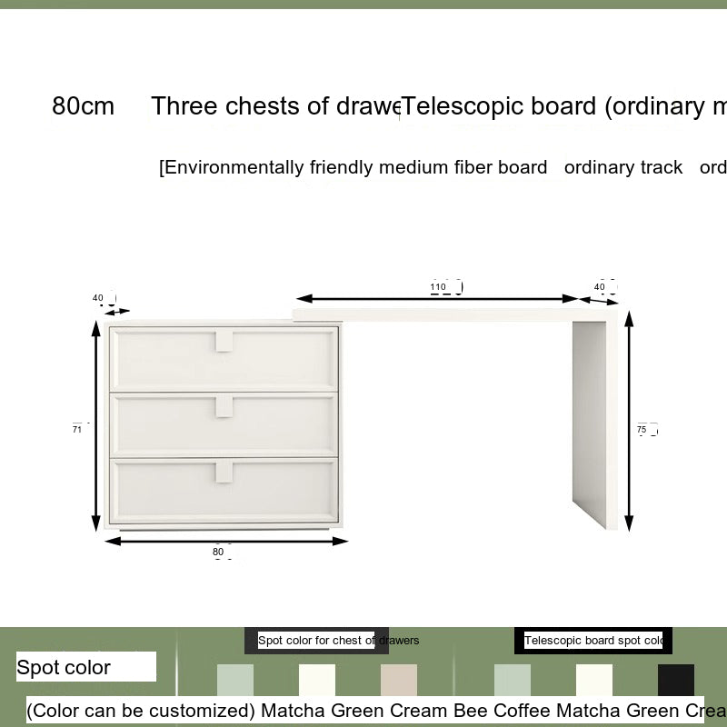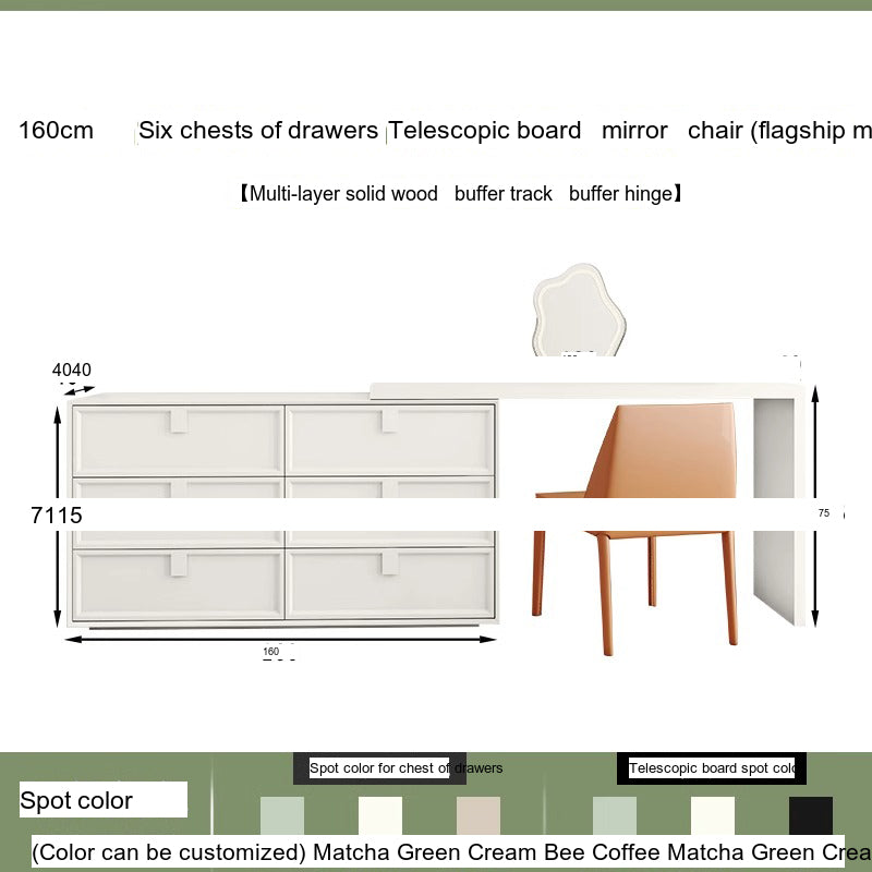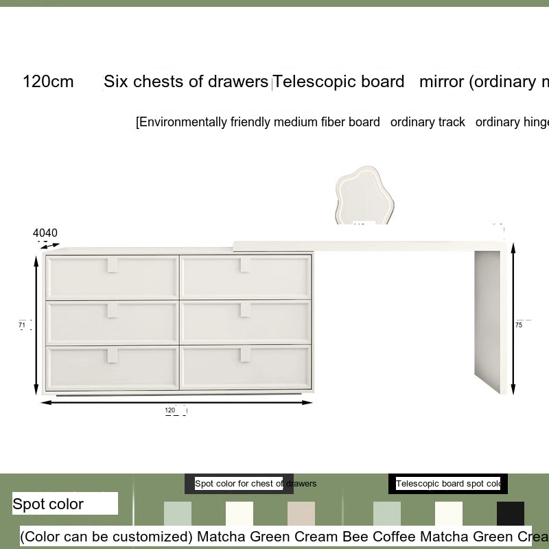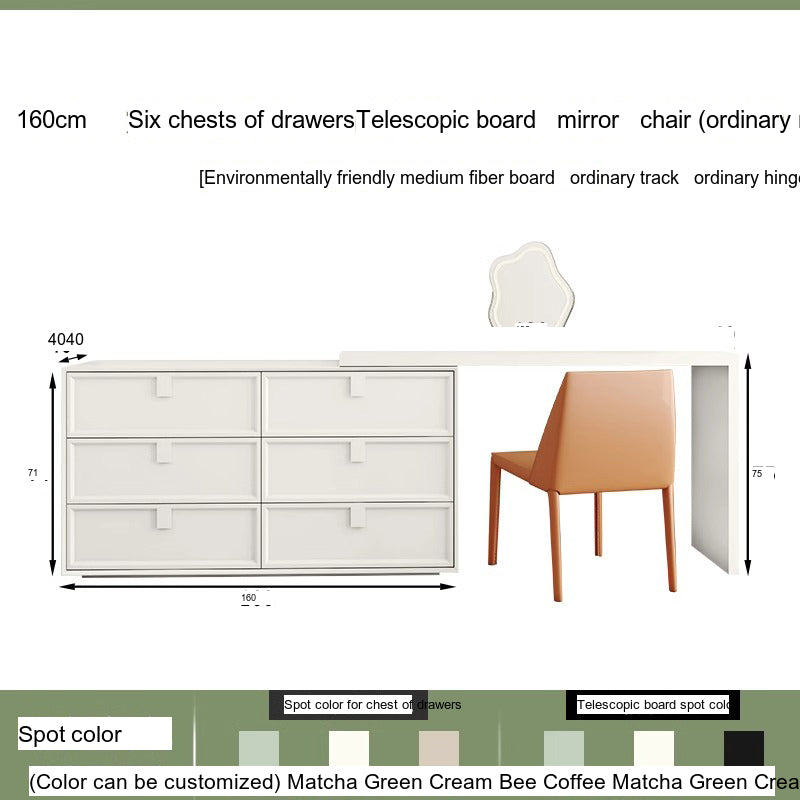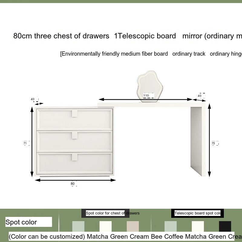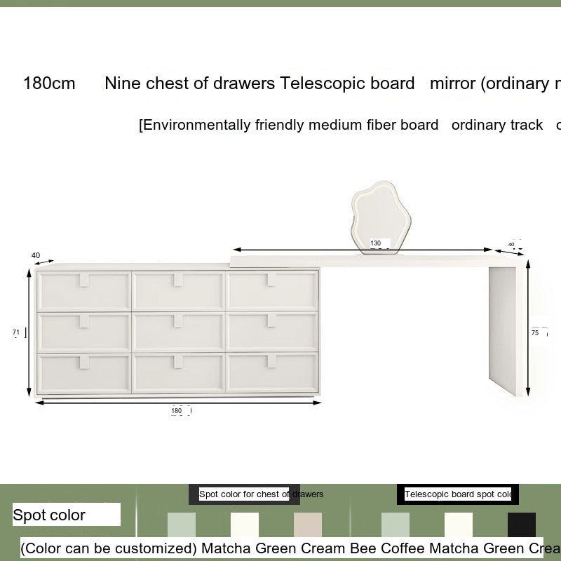 This versatile makeup table set is available in multiple sizes, ranging from 80cm, 120cm, up to 180cm, accommodating different space requirements and personal preferences. Each table features a telescopic board that can be adjusted to your desired comfort height.