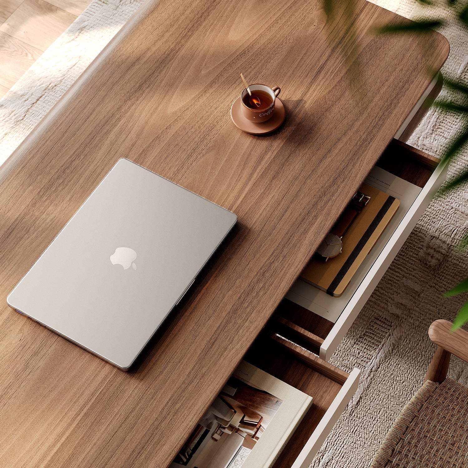The desk’s generous workspace fosters creativity and productivity; it offers a spacious center area that invites you to bring your imagination to life. It's designed to keep your workspace neat and orderly, thus promoting a focused and efficient working environment.