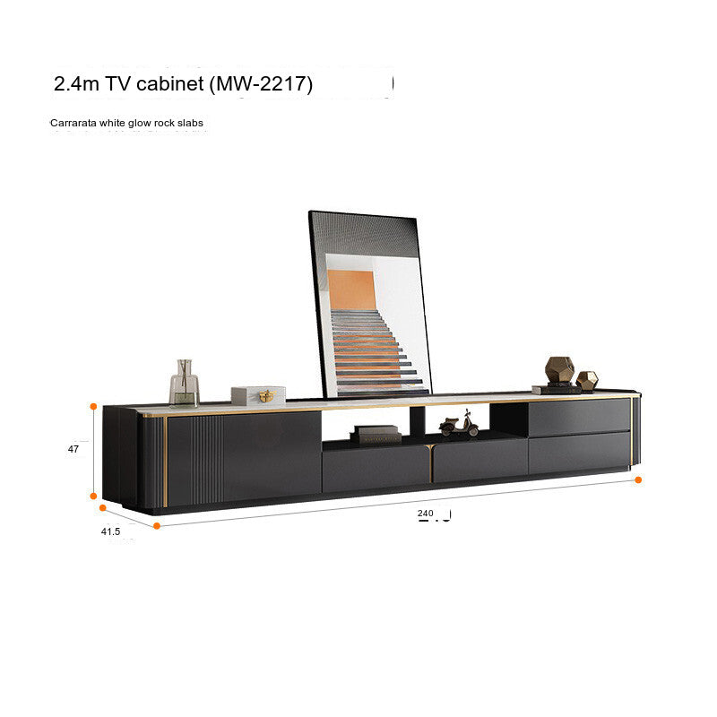 The TV cabinet showcases a stunning composition of premium materials. It features a robust 6mm thick Carrara White Slate countertop, paired with an E1 grade density board frame that has been beautifully finished in a luxurious 4C semi-matte paint. The natural texture of the rock slab not only elevates elegance but also promises durability; it is resistant to high temperatures and simple to clean. This combination ensures that your living space remains both chic and practical, making your daily life more enjoyable.