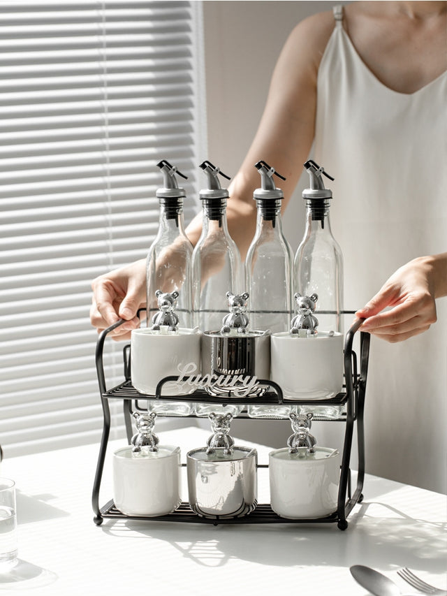 Each seasoning bottle features a glass lid that ensures visibility while also keeping dust at bay, ensuring your spices remain fresh and ready for use. The unique design includes a small spoon that facilitates effortless dispensing, allowing you to control the quantity of your ingredients precisely. The playful silver bear decoration adds a whimsical charm to this functional piece, making it a conversation starter during dinner parties.